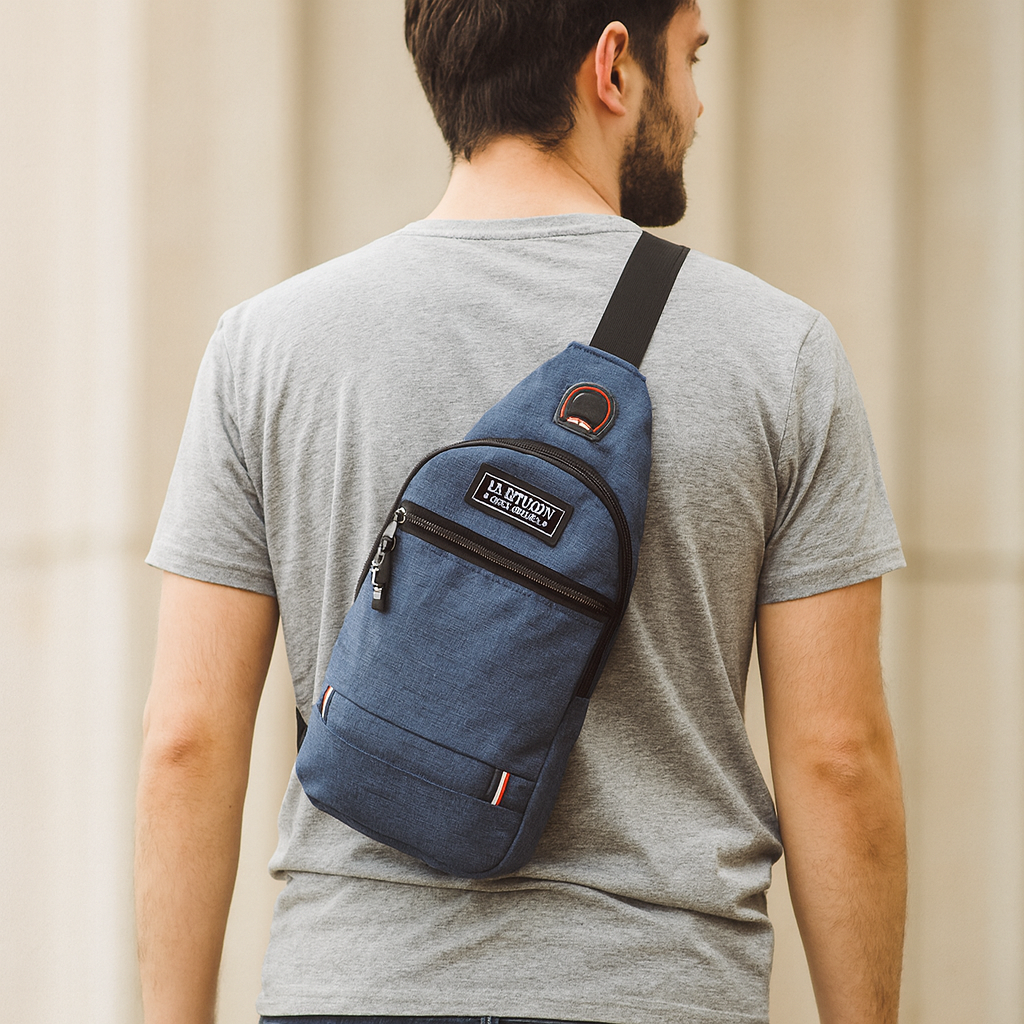 Bandolero cruzado modelo «Instinc-Nice», en tela polyester. Incluye 2 compartimentos independientes con cierre + 1 compartimento interno con cierre, salida de audífonos