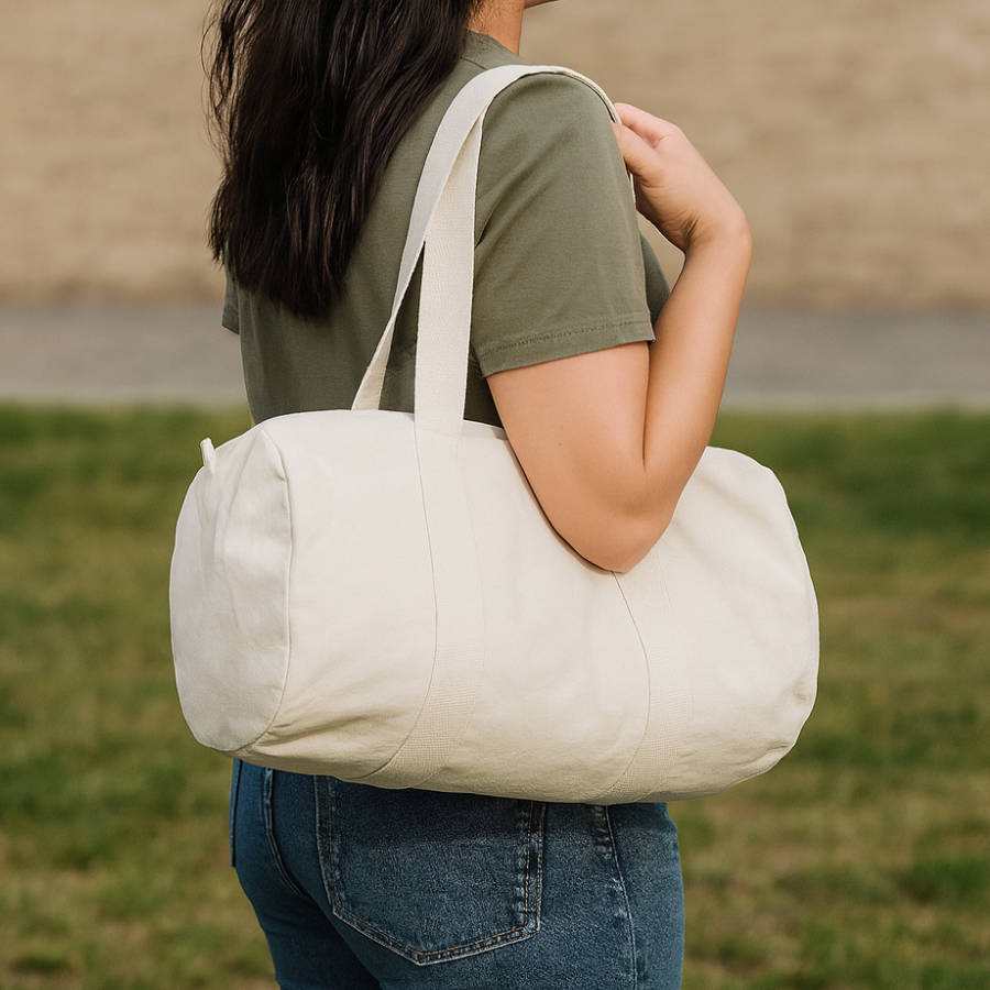 Bolso deportivo tubular de Canvas Algodón natural de 8 onzas, modelo «New Delhi». Manillas cintas de Algodón natural de 60 x 4 cm. aprox. c/u.