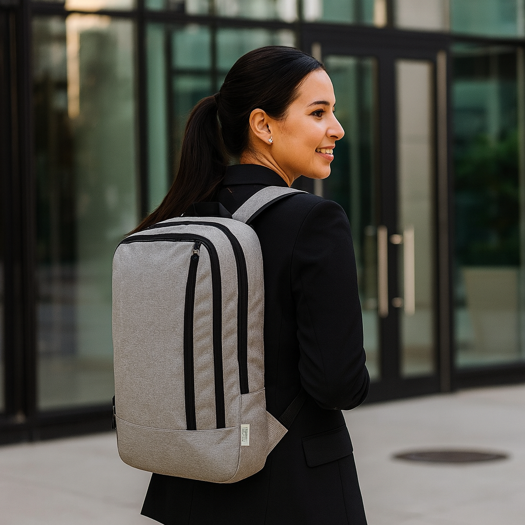 Mochila Porta-Notebook modelo «ECO». Fabricada en material reciclado PONGEE-RPET bitono, eco-cuero 210D/PU y poliéster 300D/PU. Capacidad 12.5 litros, tamaño 30 x 41.5 x 10 cm. Incluye compartimento interior reforzado y acolchado para Laptop y doble bolsillo delantero.