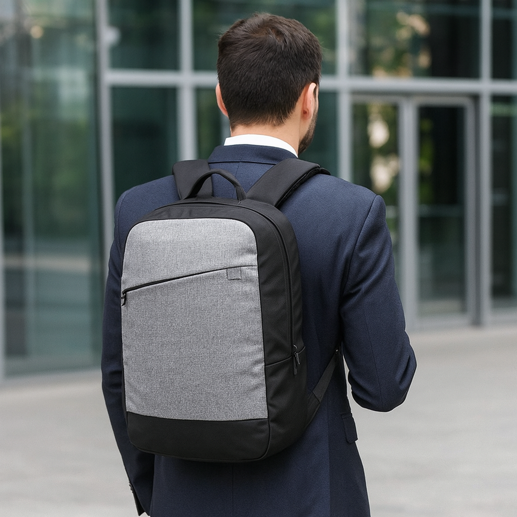 Mochila Porta-Notebook modelo «Finland». Tela PU 300D Two-Tone impermeable. Capacidad 16 litros, tamaño 34 x 47 x 10 cm. Incluye compartimento interior reforzado y acolchado para Laptop. Bolsillos interiores y delantero.