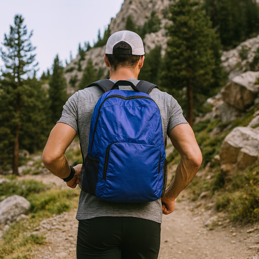 Mochila retráctil de poliéster Ripstop 210D. Se retrae y se guarda en bolsillo delantero, quedando de un tamaño rectangular compacto de 20 x 19 cm