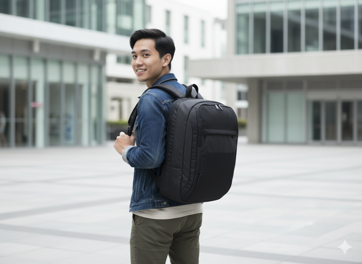 Deluxe Mochila Porta-Notebook modelo «VECTOR». En tela poliéster 600D/PVC + eco-cuero PU 210D. Capacidad 15 litros, tamaño 29.5 x 42 x 12 cm. Incluye 2 compartimentos interiores reforzados y acolchados para Laptop, espalda acolchada con red de ventilación + bolsillo de seguridad con cierre y bolsillo delantero